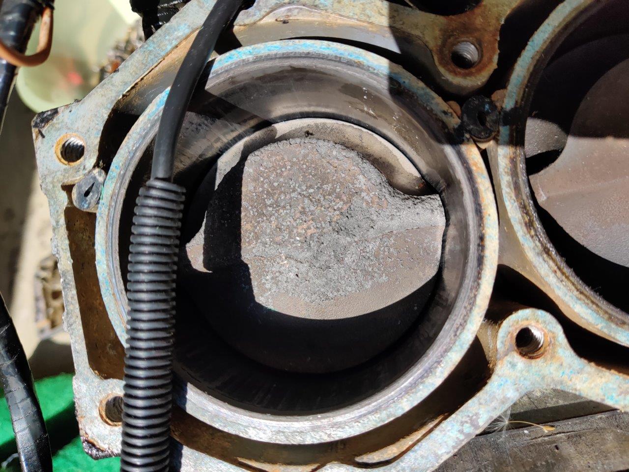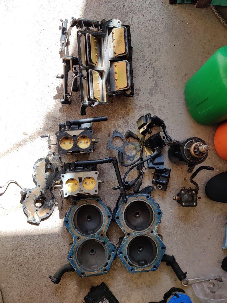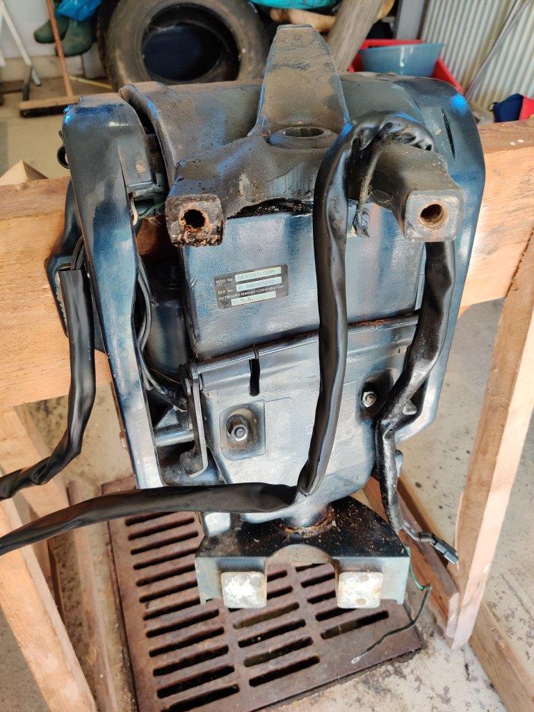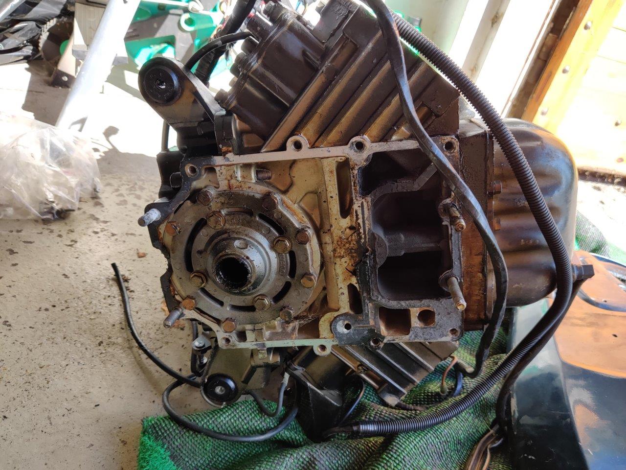 Sukulaismiehen osiksi purettu 110 hp Evari, malli CE110TLCEM. Vasemman (takaa katsottuna) alasylinterin männän renkaat ilmeisesti hävinneet, mäntä raapinut sylinteriin. Muuten ihan toimivana purettu ja hyväkuntoisen oloinen kone, kaikki pultit aukesivat suosiolla, ei isommin hapettumia, ollut järvellä. Konerempalla osista saa vielä ihan soivan pelin.
