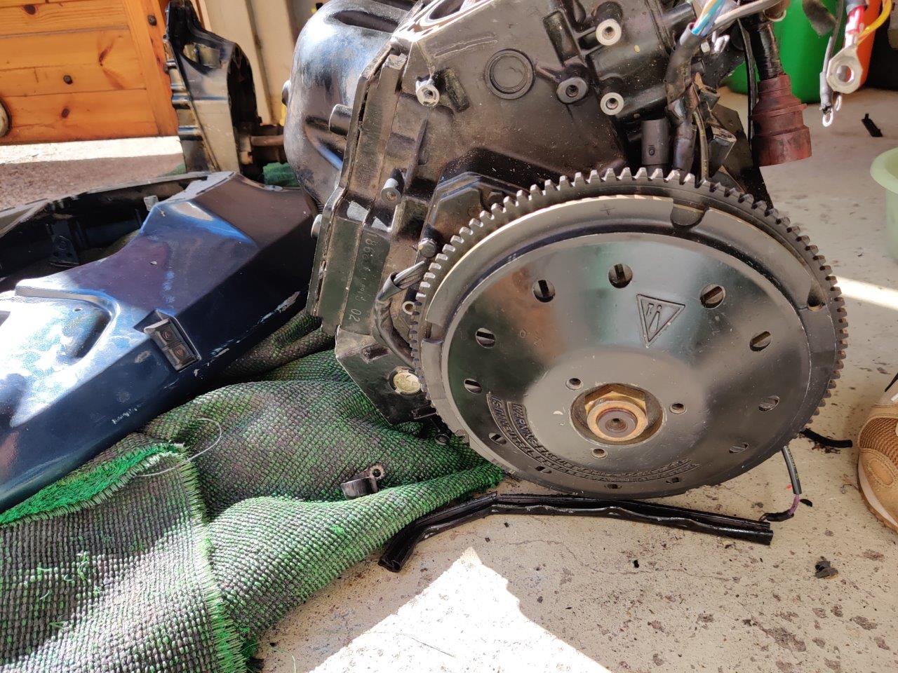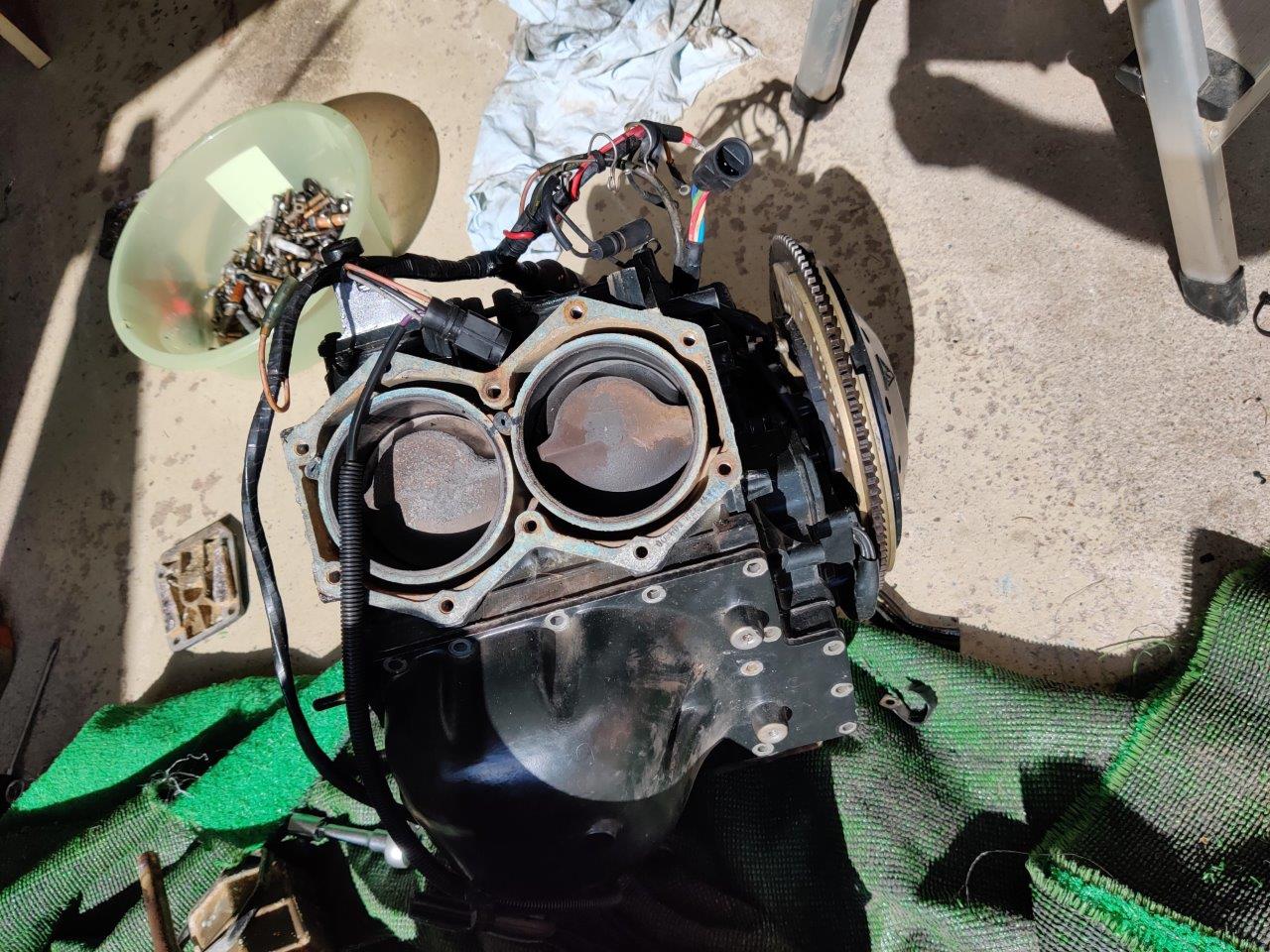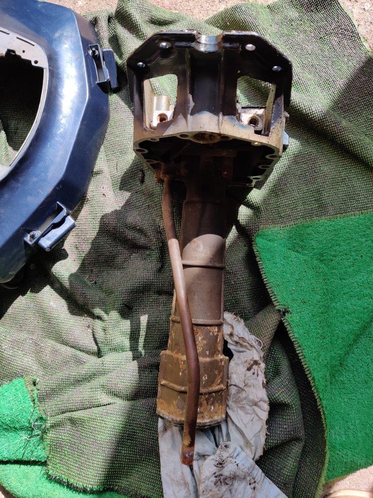 Sukulaismiehen osiksi purettu 110 hp Evari, malli CE110TLCEM. Vasemman (takaa katsottuna) alasylinterin männän renkaat ilmeisesti hävinneet, mäntä raapinut sylinteriin. Muuten ihan toimivana purettu ja hyväkuntoisen oloinen kone, kaikki pultit aukesivat suosiolla, ei isommin hapettumia, ollut järvellä. Konerempalla osista saa vielä ihan soivan pelin.