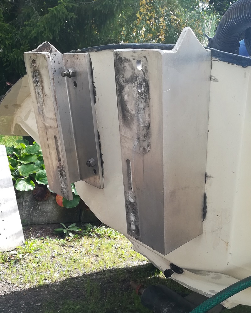 Vauhtiveneen setback perämoottori teline. T-H Marinen lupaama max. koneteho 150hv. Setback 10cm.