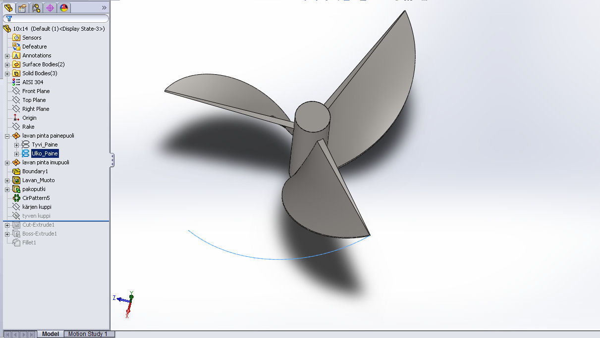 Potkurin valmistus on kohtuu monimutkainen prosessi, sille pitäisi ehkä tehdä kokonaan oma aihe mutta pääpiirteissään homma menee näin. Potkuri mallinnetaan jollain 3d ohjelmalla, itse käytin solidworksia,