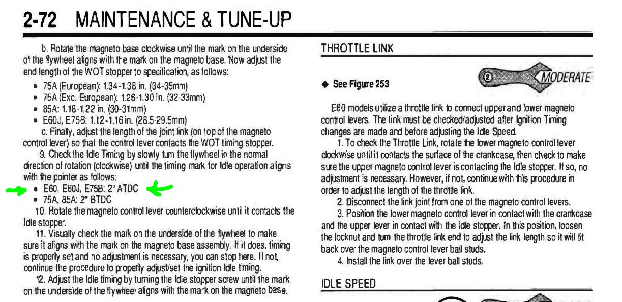Koneen säädöt oli hankittaessa vähän mitä sattuu, ja käynti oli huono, joten niistä ei ollut oikein apua. Jonkun manuaalin mukaan 60FETOn WOT-ennakko olisi vain 18ast BTDC, ja jonkun toisen vuosimallin taas jopa 23ast BTDC. Onko kellään hajua 60FETO -88 euromallin oikeista säädöistä? Tässä on staattinen ennakon säätö, eikä sytkäboksin kannessa ole säätövipua, jota monissa manuaalien kuvissa näkee. Lisäksi olen yrittänyt arpoa, miten nuo hengityksen parannustoimet vaikuttaa mahdolliseen ennakkoon, olisiko sitä syytä lisätä tai vähentää sen takia.