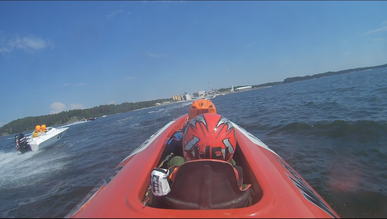 Kisa alkoi vähän myöhässä, mutta kaikki 16 venekuntaa pääsivät matkaan. Kisan pituus oli myötäpäivään lähtö + 5 kierrosta. Kisassa kaikki meni pääosin yllättävän hyvin. Sijoitus vaihteli 3-5 välissä ja maalissa sijoitus oli viides. Vasta kisan jälkeen ja nosturilla alkoivat kovan kelikisan vahingot paljastua. Ensimmäisenä vettä suihkusi perälaudasta sisälle. Sanoin kartturille, että otetaan rauhallisesti ja kiinnitetään nostoliinat. Sen jälkeen kartturi huusi Ruotsiksi laiturille, että meillä on vuoto ja saatiin vene nosturille, sekä ylös jonon ohi. Kun vene nostettiin ylös niin paljastui, että pohjan muokkaus oli revennyt peräpäästä ja toinen trimmilevy puuttui kokonaan. Oli vain katkennut sähköjohto jäljellä ja saranien pultit olivat korkanneet perälaudasta läpi.
