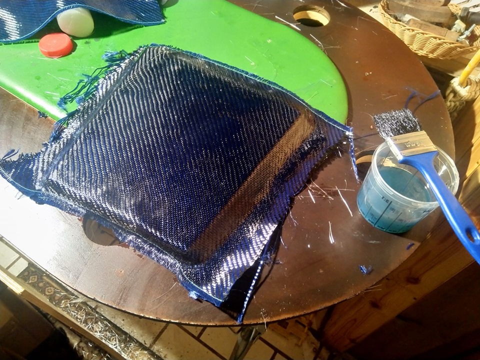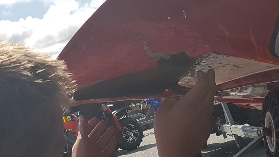 Nopea tuumaustauko ja lainaamalla saatiin lasikuitutarvikkeet korjausta varten ja ei muuta kuin rälläkkä laulamaan. Vene korjattiin odottamaan iltakisaa.