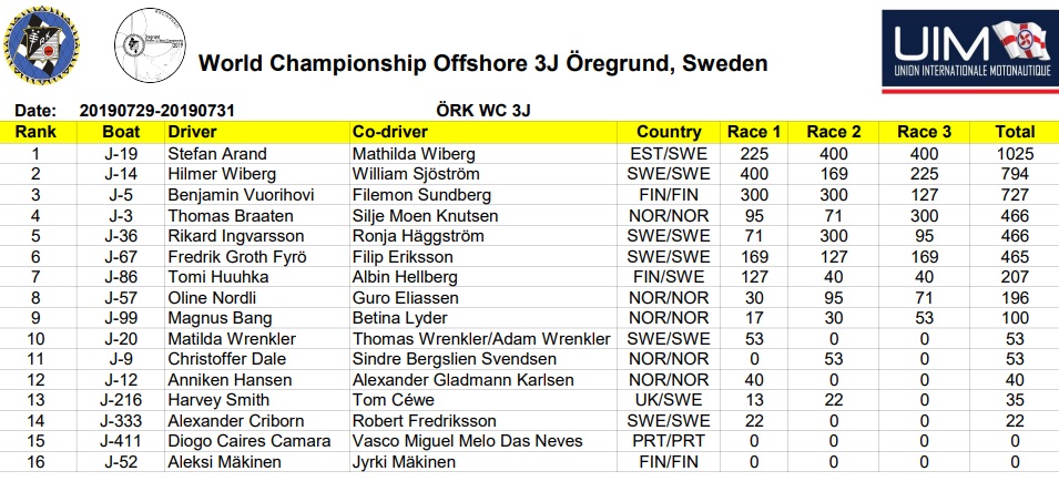 Nopeus oli lähes koko kisan ajan 45 solmua ja parhaat ajoivat sen noin 50. Kaksi Ruotsalaista tiimiä eivät saanet veneitä kulkemaan ja heille sijat 4 ja 5.